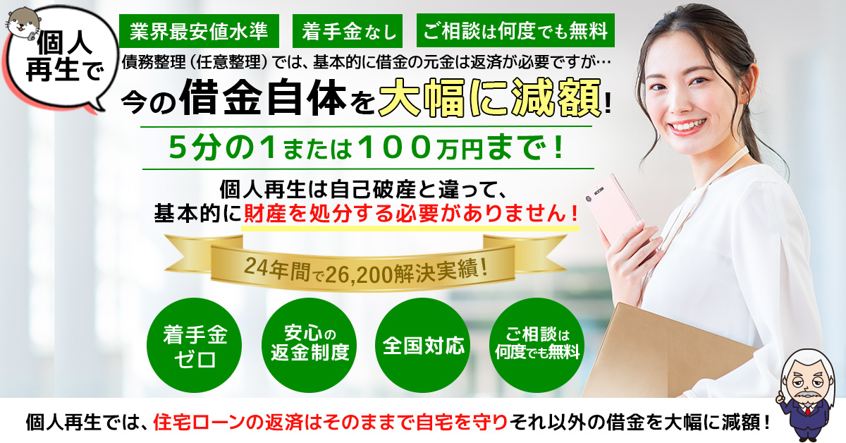 個人再生は自己破産のようにすべての返済義務がなくなることはありませんが、現在ある借金の総額を5分の1または100万円まで大きく減額することが可能です。