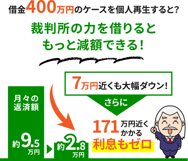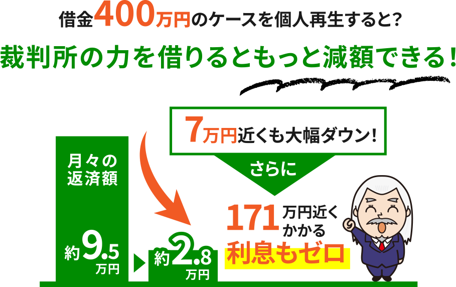 例を挙げますと、借金の総額が500万円ある場合は、その借金を100万円まで大きく減額することができます。