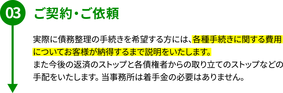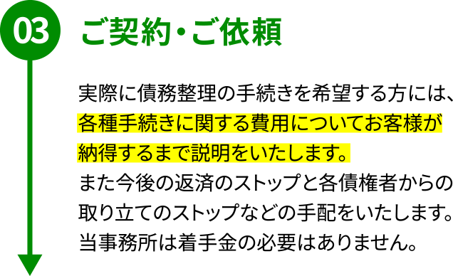 あなたの借金問題を解決できなかったのに債務整理の費用をいただくことは当事務所の仕事に対する信念を曲げることになってしまうからです!