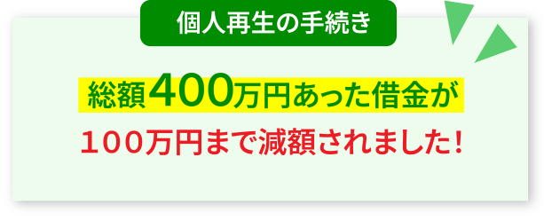 依頼後は今までの返済をストップしていただいたので個人再生の費用の積み立ても順調に進み、個人再生の申し立てで今ある借金が大幅に減額され、無事に借金問題を解決することができました。
