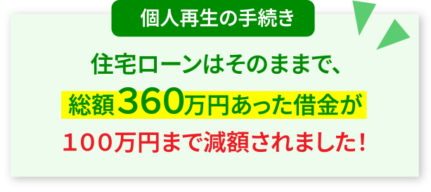個人再生では、住宅ローンの支払いはそのままで、それ以外の借金を100万円まで圧縮できるということを教えていただき、すぐに個人再生の手続きをお願いいたしました。